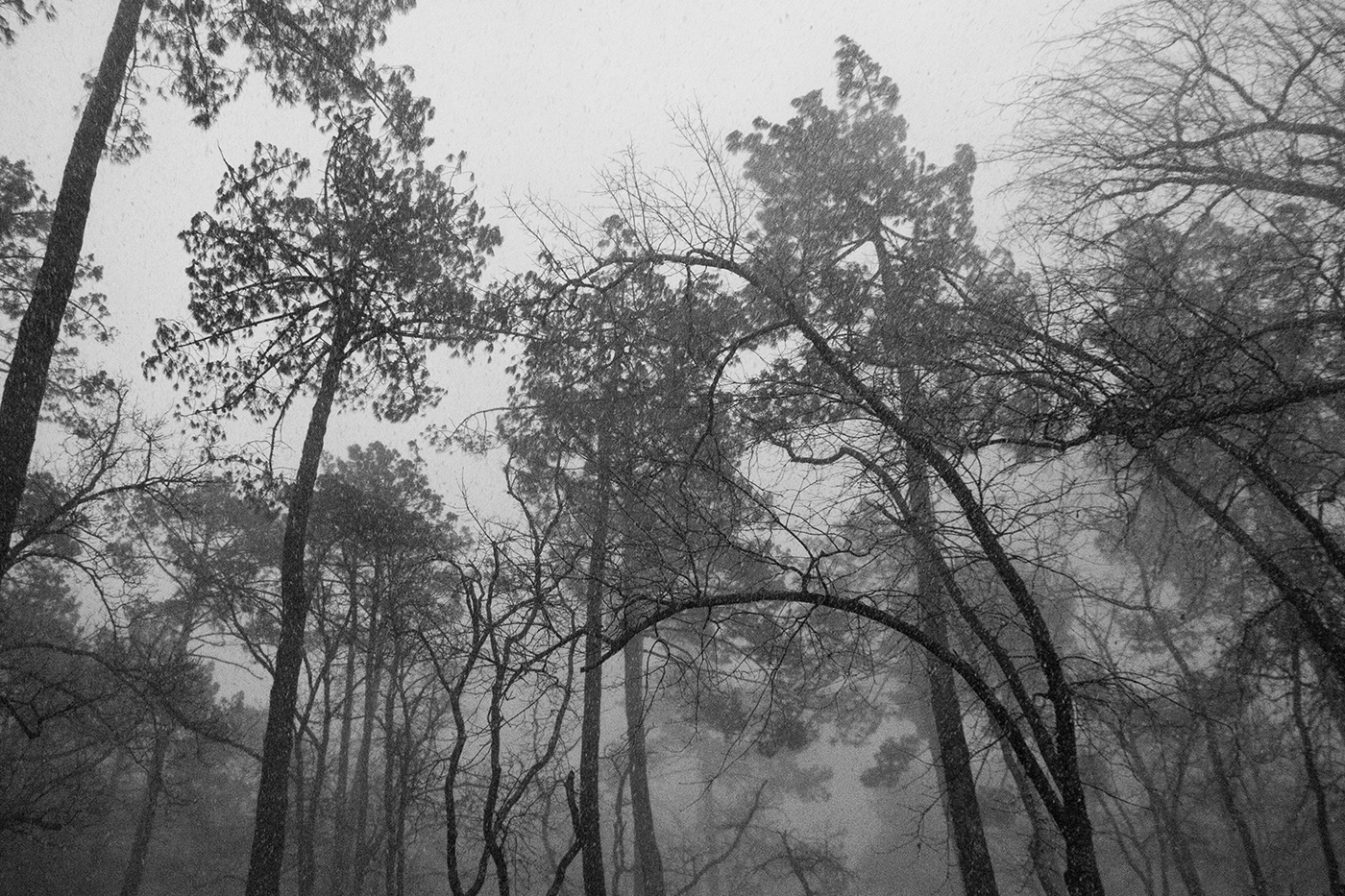 Au milieu des pins géants qui se tordent dans la tempête,